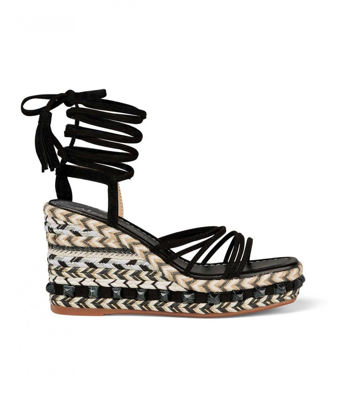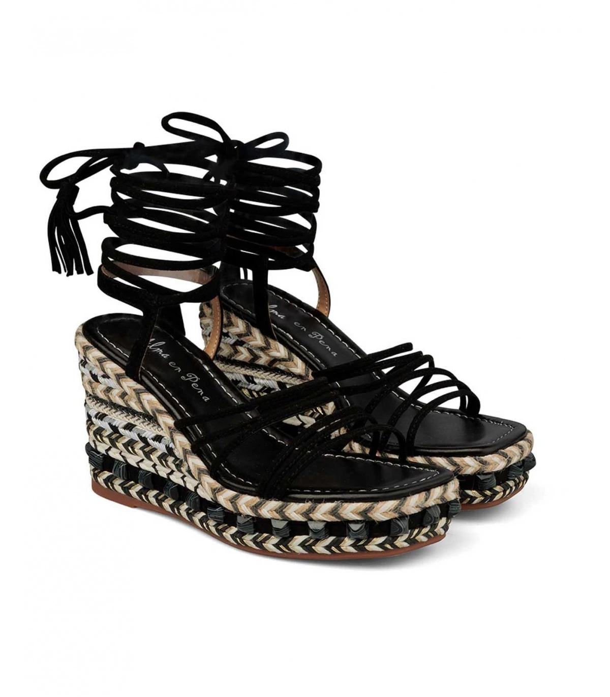 Sandalia cuña de piel con detalle trenzado y pedrería. Punta cuadrada con tiras. Cierre con cordones terminado con detalle de pompones y altura de tacón de 9,5cm