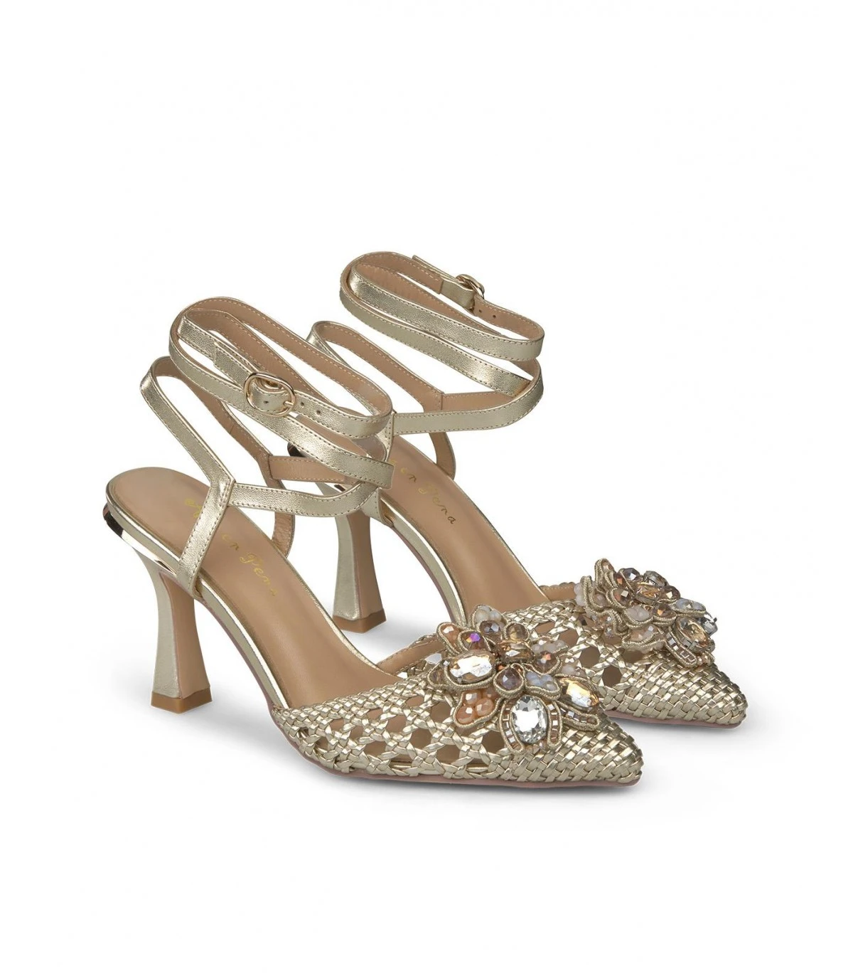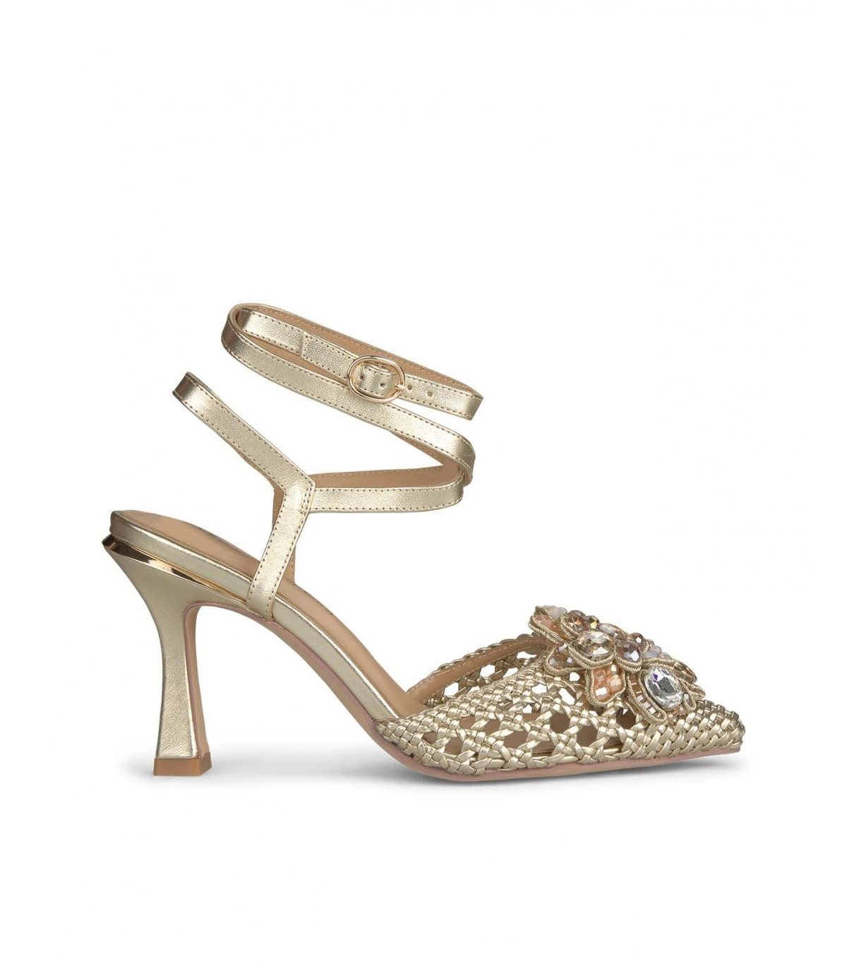 Salón de piel destalonado troquelado con detalle de pedrería en la puntera y cierre de tiras cruzadas. Plantilla acolchada de piel. La altura del tacón es de 9cm.