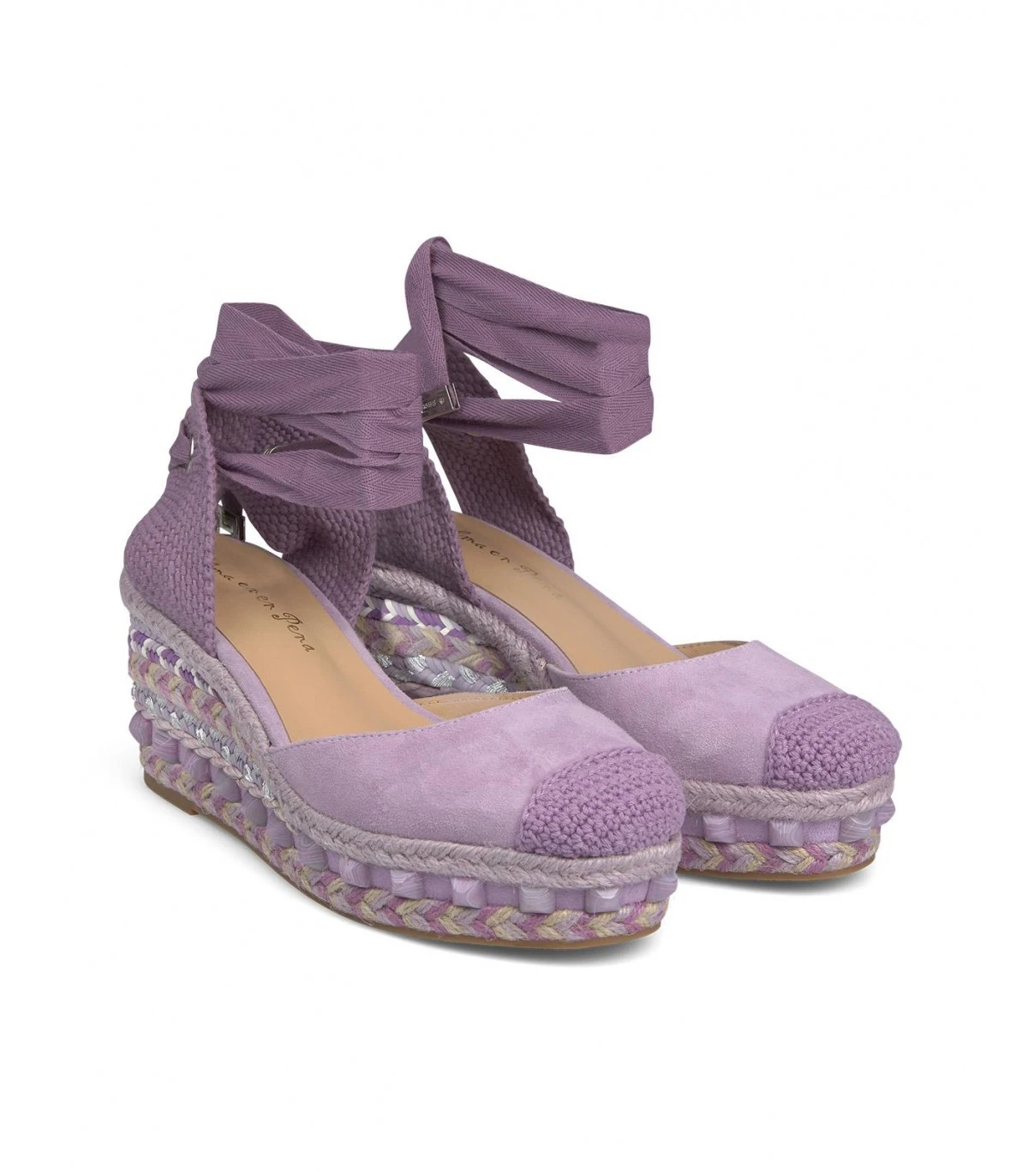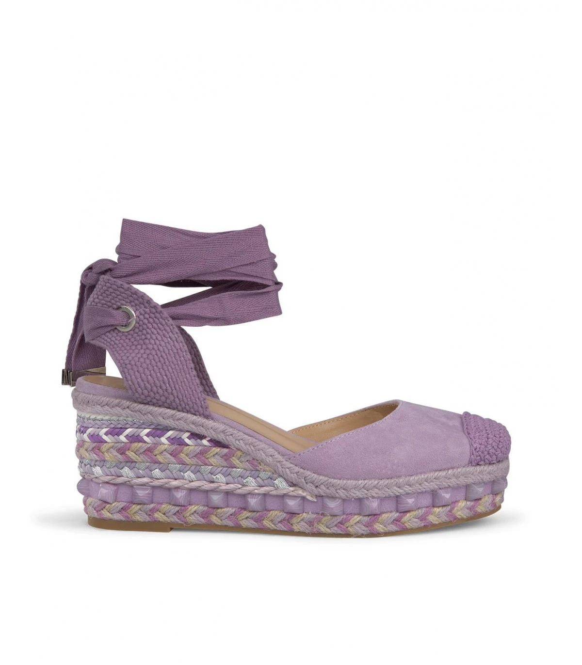 Sandalia cuña valenciana de piel con punta rendondeada, cierre con cordones en tobillo. Suela acolchada. Altura del tacón de 7cm