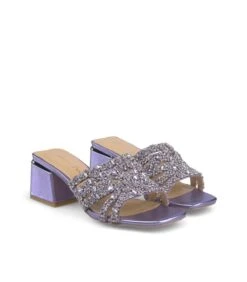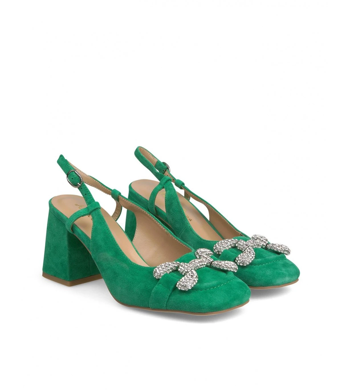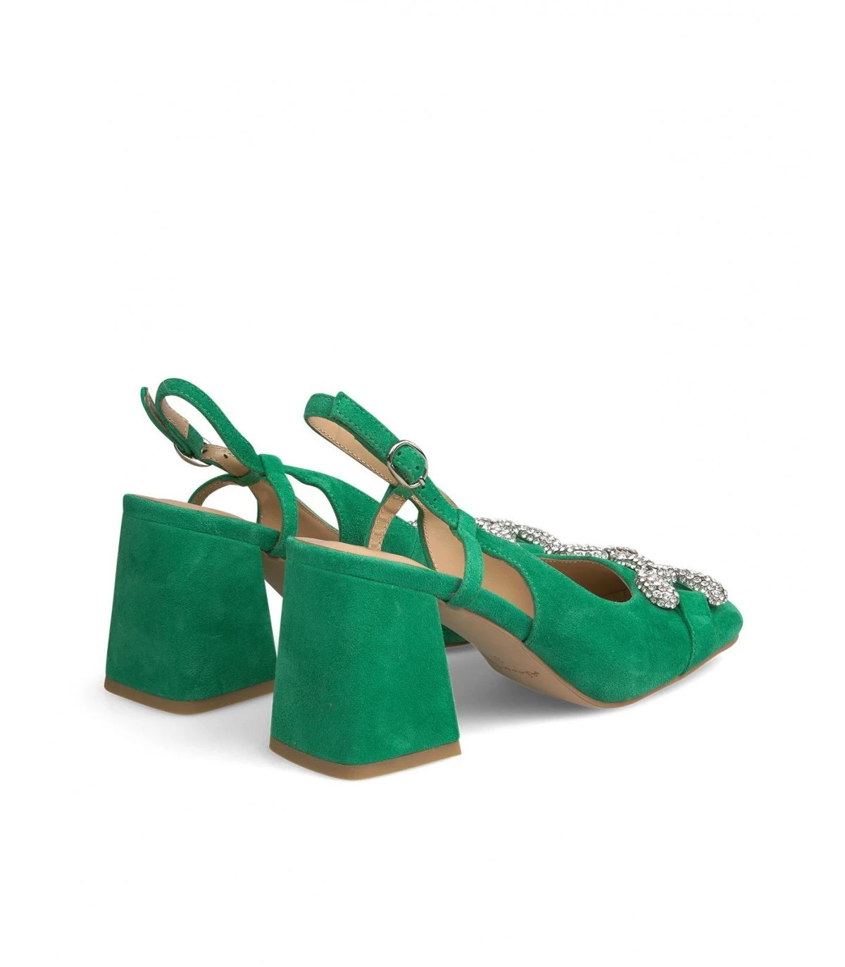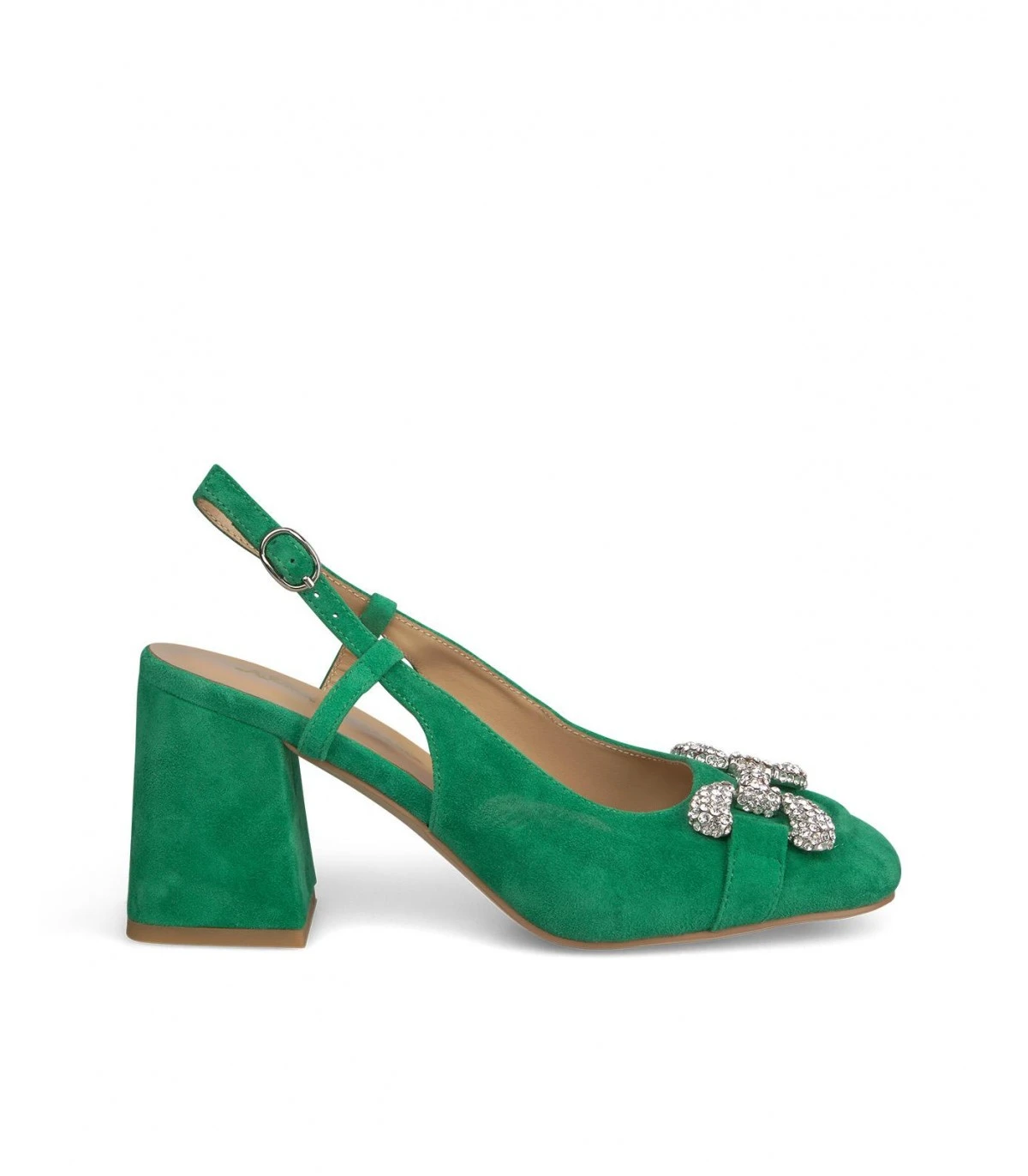 Zapato de tacón de piel destalonado con detalle de pedrería en la puntera y cierre con hebilla. Plantilla acolchada de piel. La altura del tacón es de 8cm.