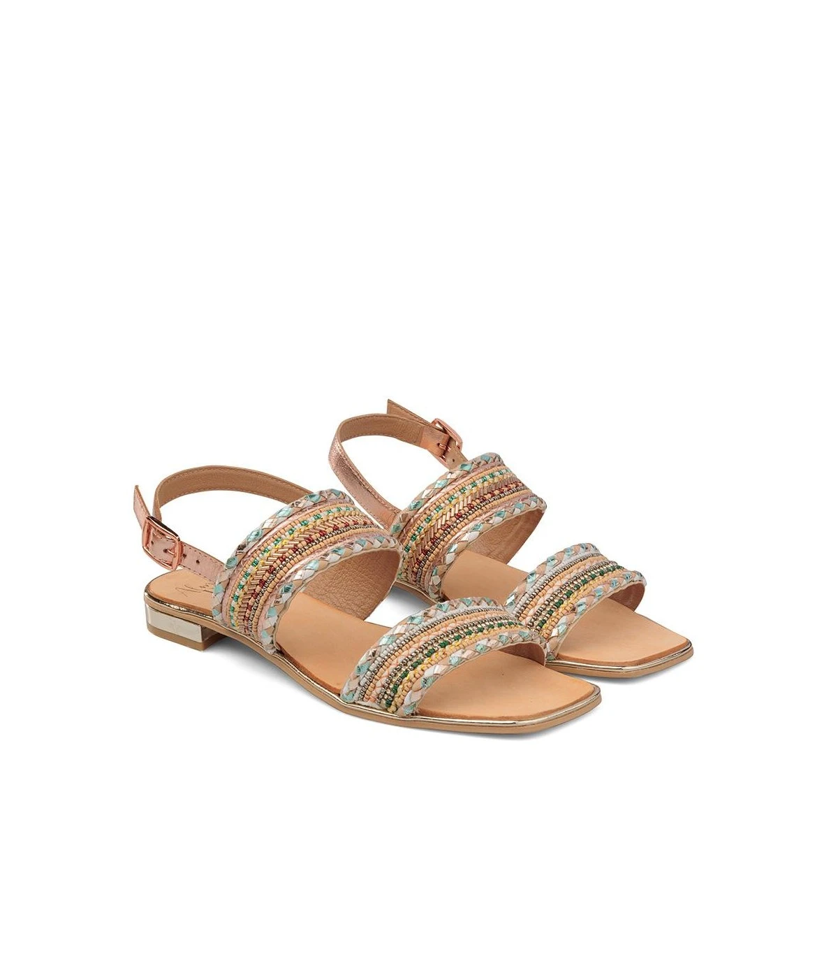 Sandalia plana con tiras de pedrería y trenzados multicolor. Plantilla acolchada para un mayor confort. La altura del tacón es de 1cm.