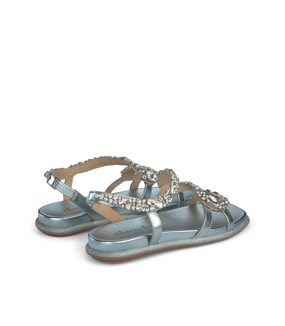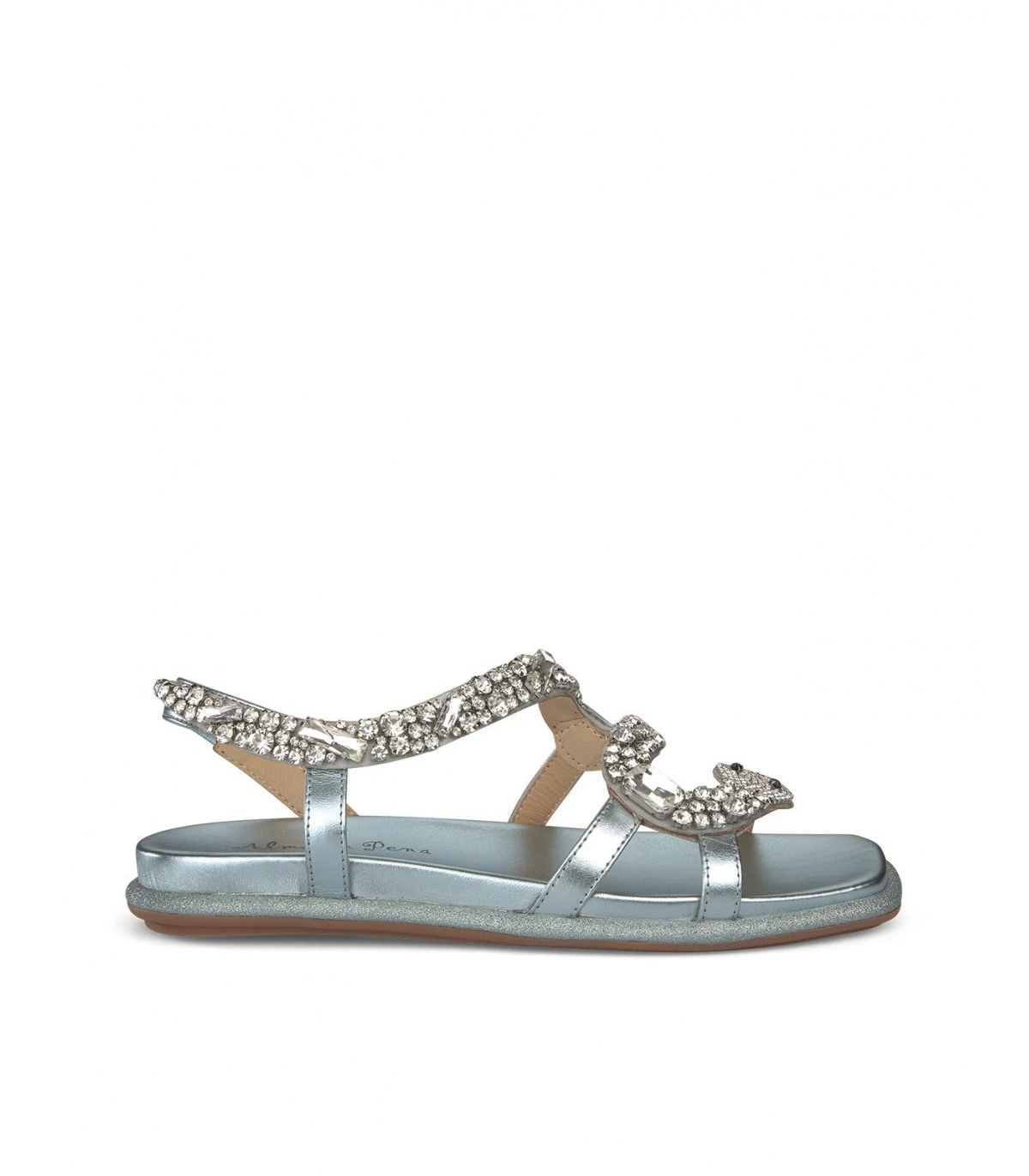 Sandalia plana de piel y punta cuadrada con pedrería. Tira de pedrería en delantero. Suela acolchada.