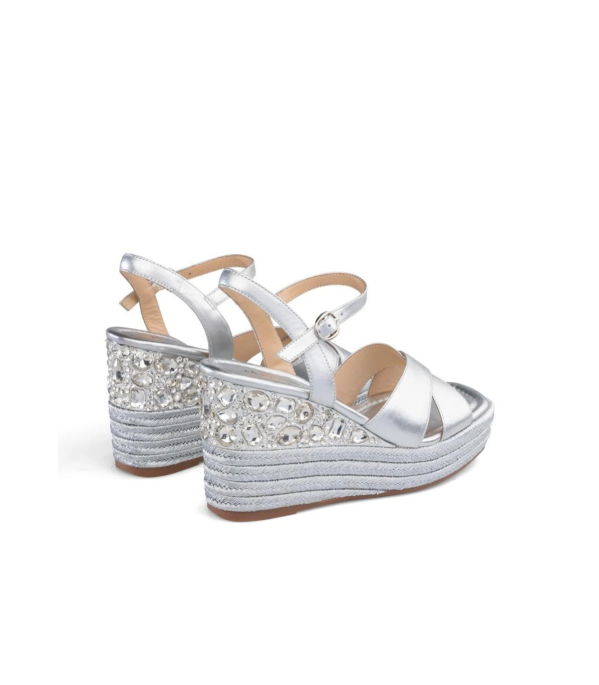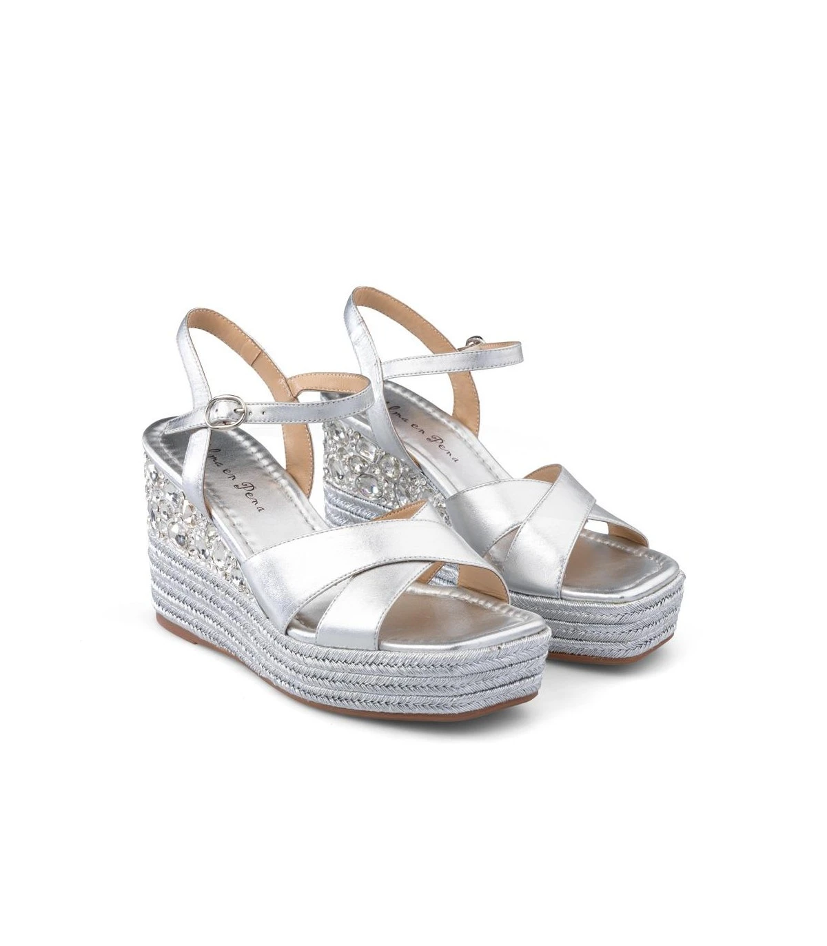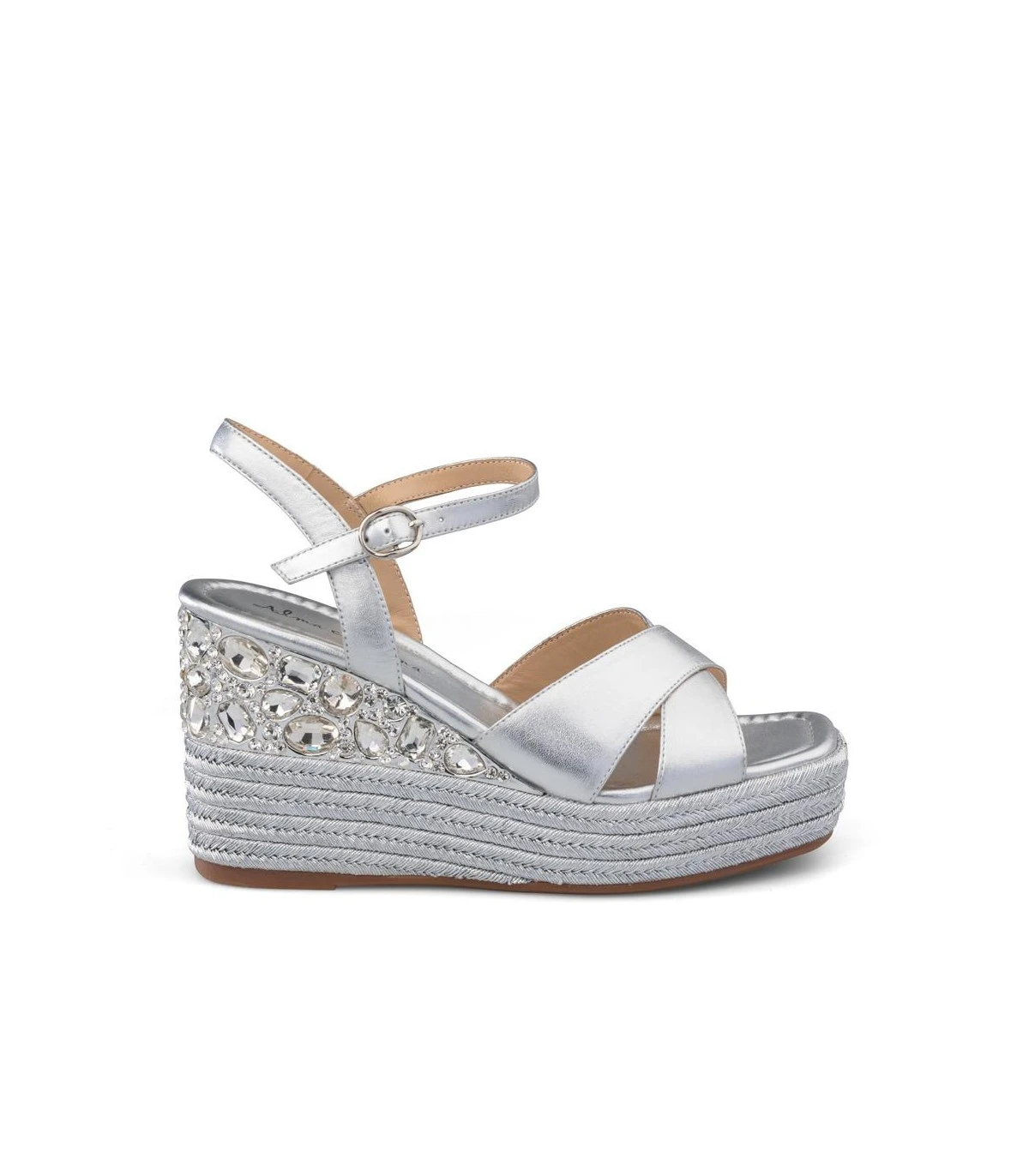 Sandalia cuña de piel con detalle trenzado y de pedrería en tacón. Punta cuadrada. Cierre con hebilla en tobillo. Altura de tacón de 9,5cm.