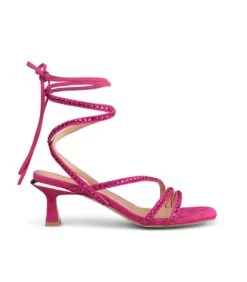 Sandalia de tacón realizada en piel con adornos de pedrería. Tiras envolventes al tobillo. Plantilla acolchada de piel. La altura del tacón es de 5,5cm.
