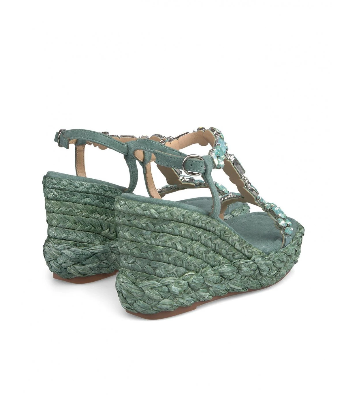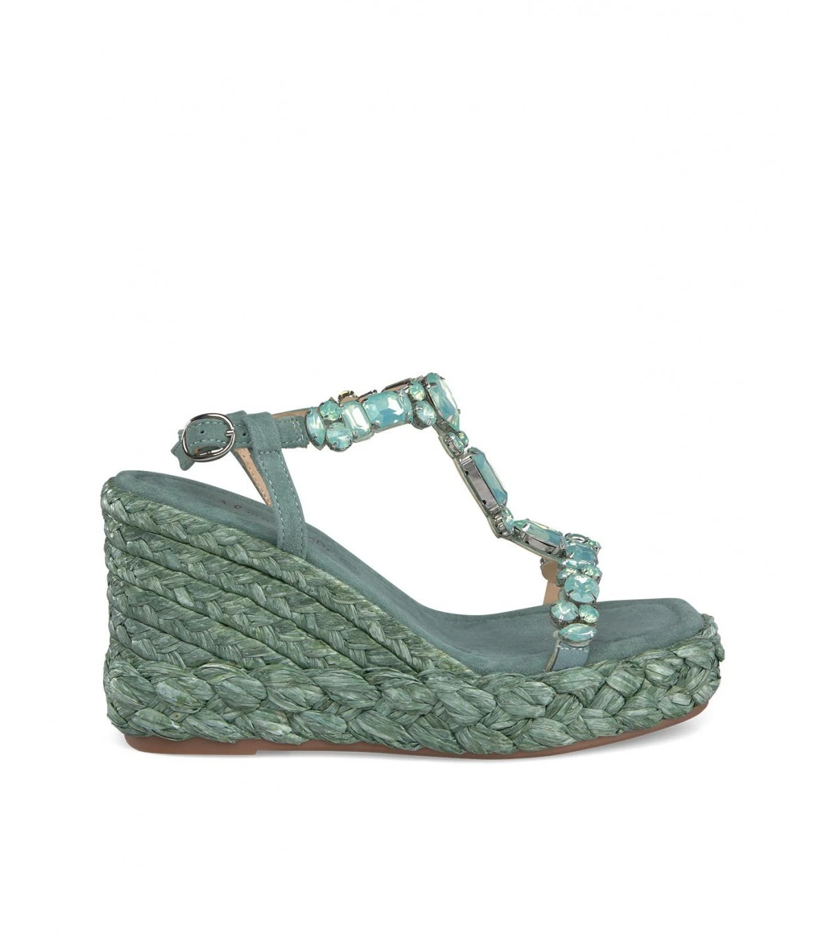 Sandalia cuña de piel con detalle trenzado y de pedrería en delantero. Punta cuadrada. Cierre con hebilla en tobillo. Altura de tacón de 9,5cm.