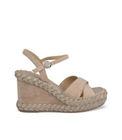 Sandalia cuña de piel con adorno trenzado. Plantilla de piel acolchada para un mayor confort. La altura del tacón es de 9,5cm.
