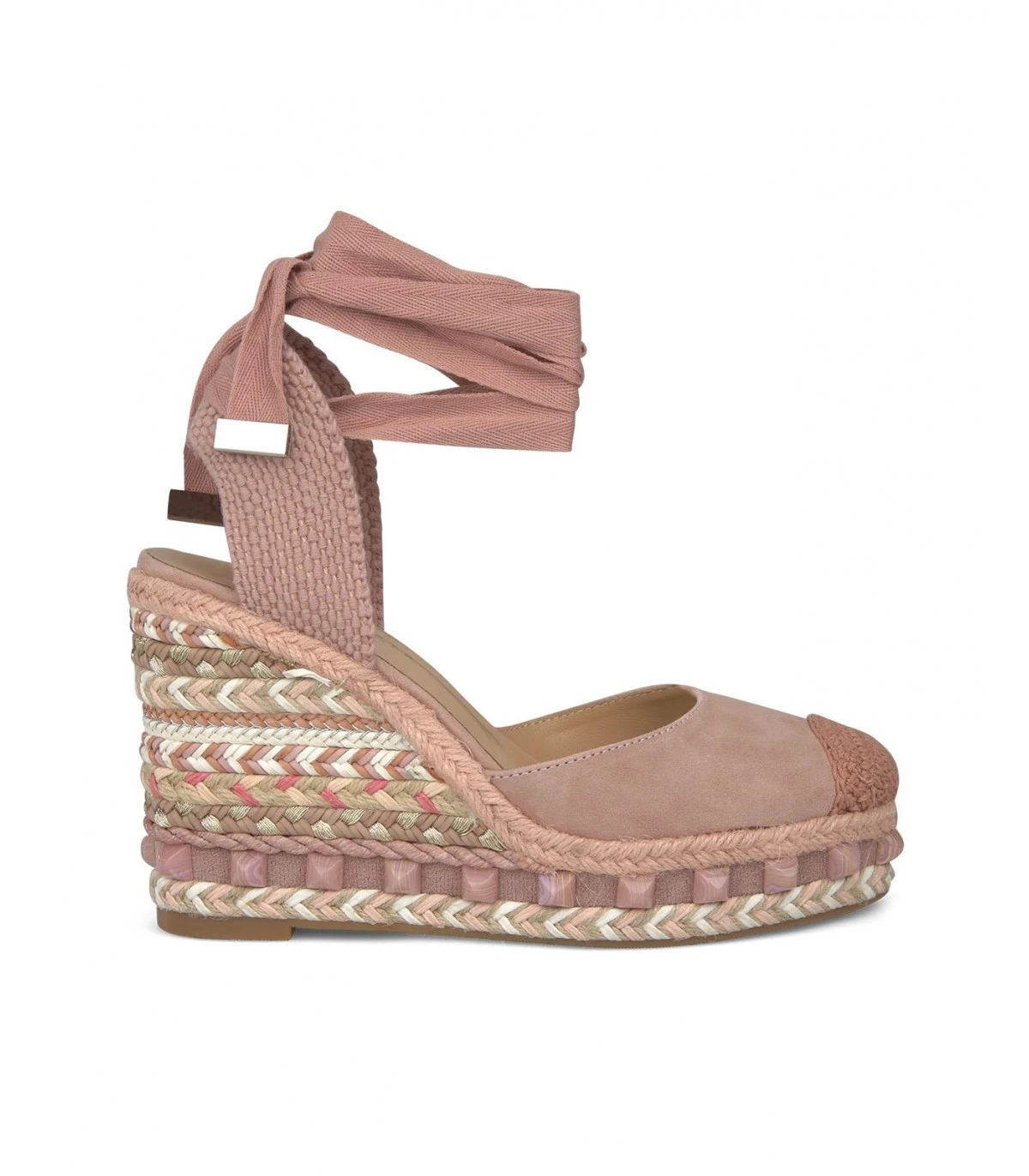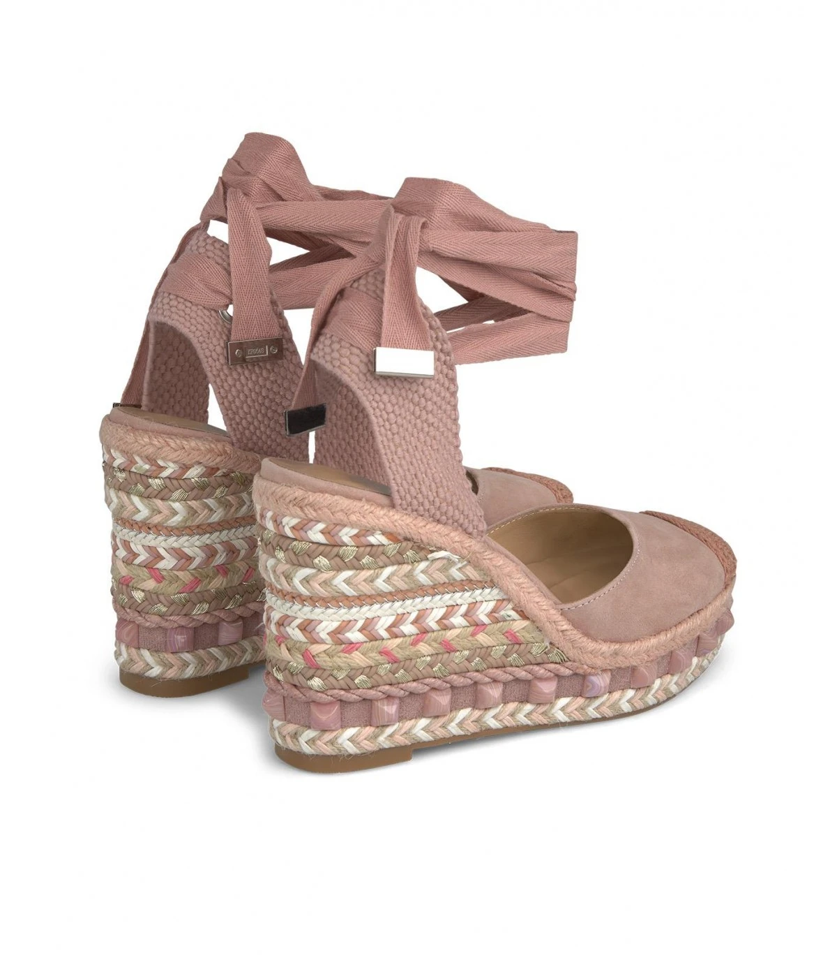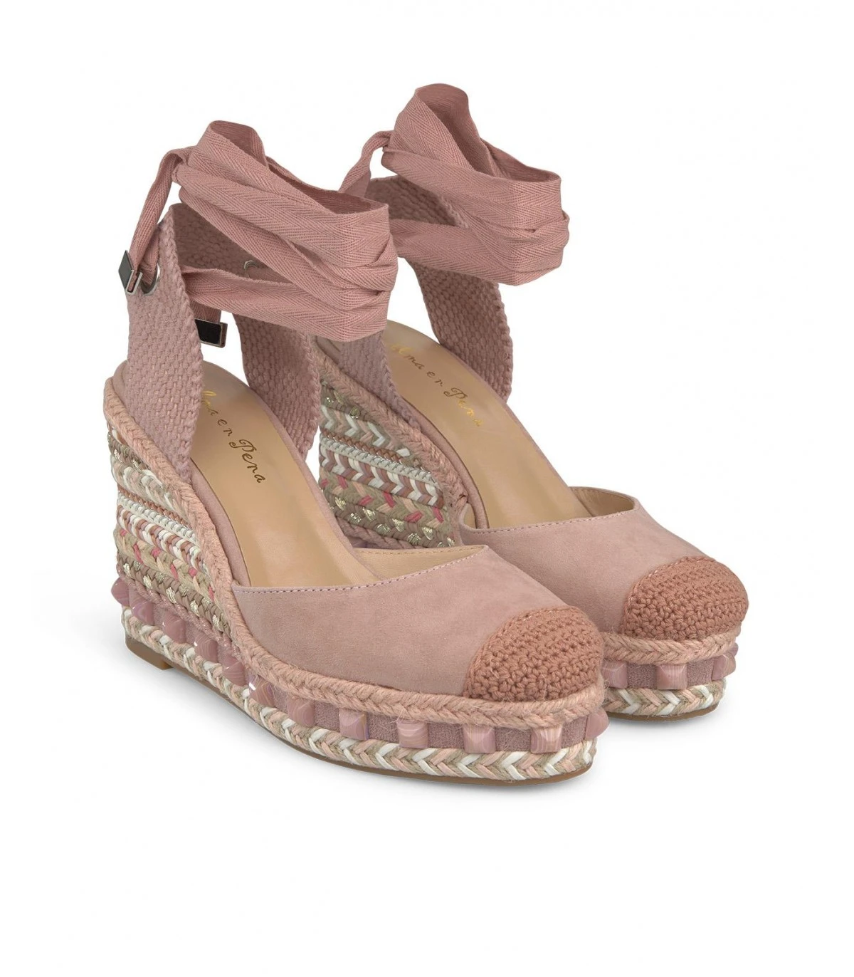 Sandalia cuña valenciana de piel con punta rendondeada, cierre con cordones en tobillo. Suela acolchada. Altura del tacón de 11cm