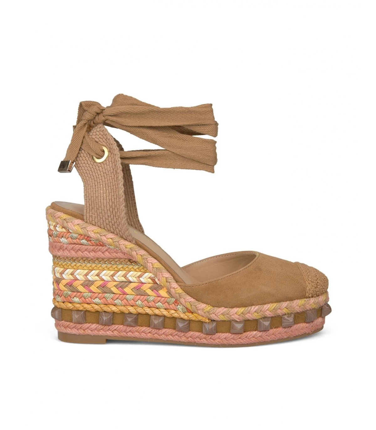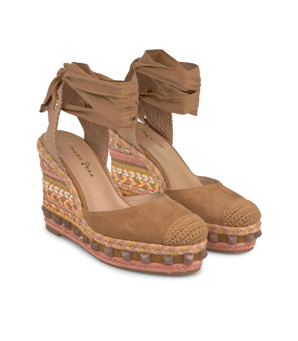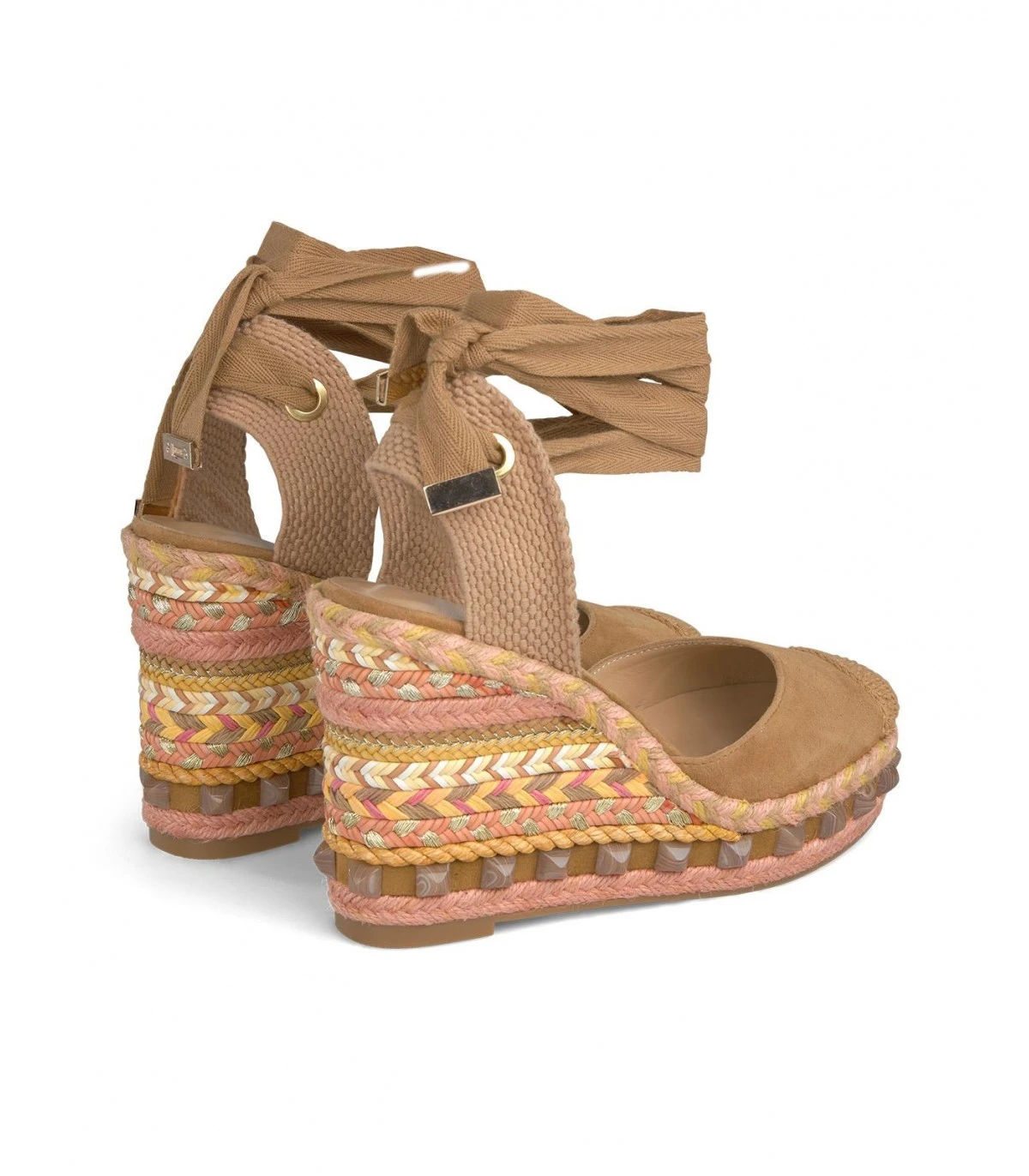 Sandalia cuña valenciana de piel con punta rendondeada, cierre con cordones en tobillo. Suela acolchada. Altura del tacón de 11cm