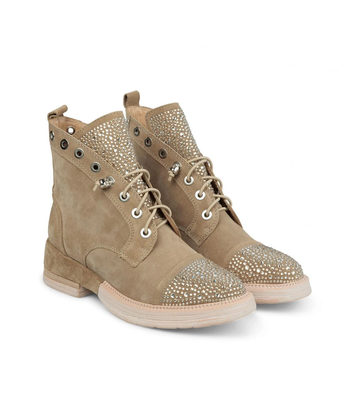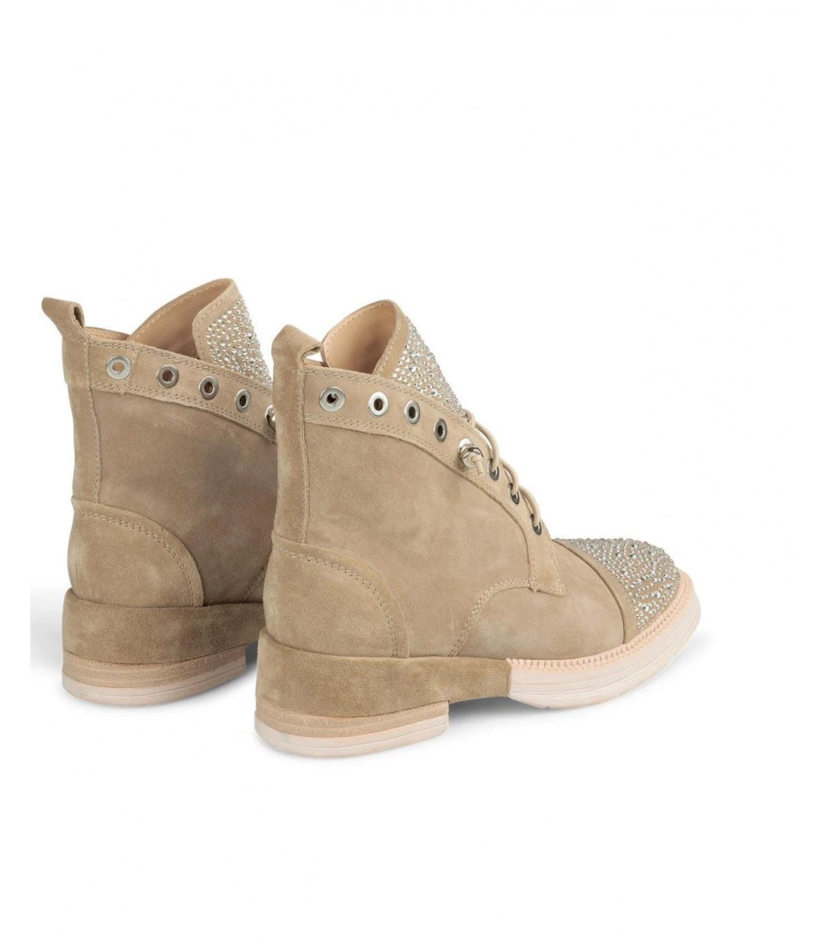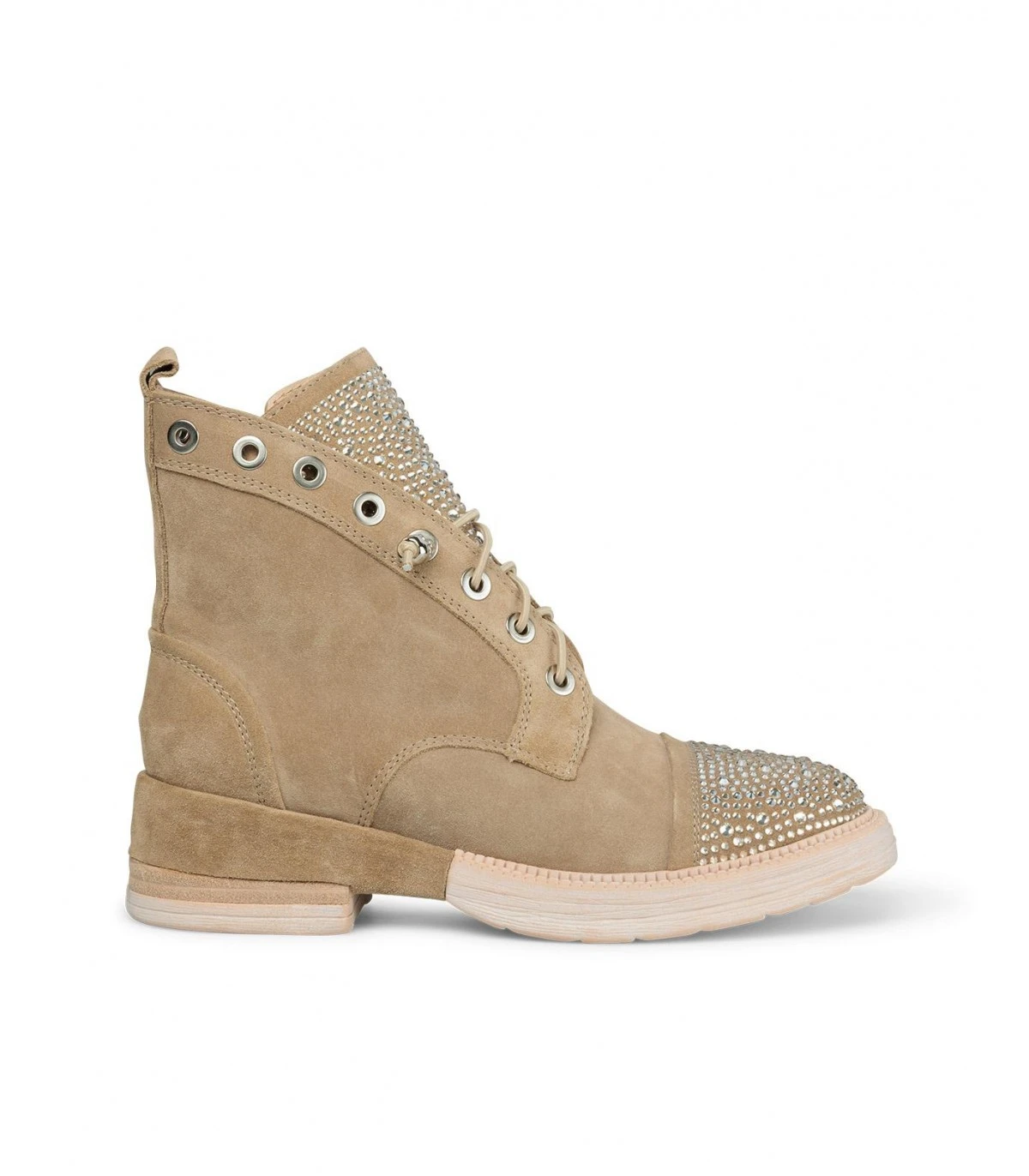 Botín de piel con detalle de pedrería. La altura del tacón es de 2cm y la altura de la caña es de 12cm. Plantilla acolchada de piel.