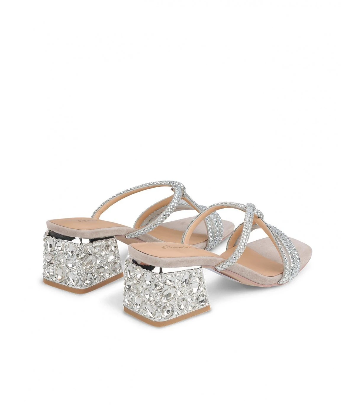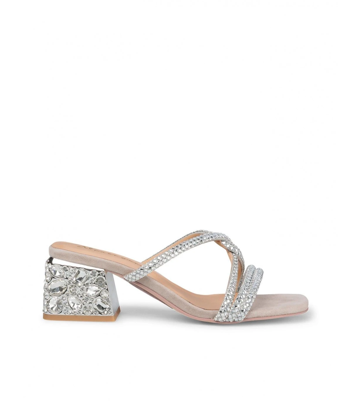 Sandalia de tacón cubierto de pedrería y tiras delanteras cruzadas con pedrería. Plantilla acolchada para un mayor confort. La altura del tacón es de 6cm.