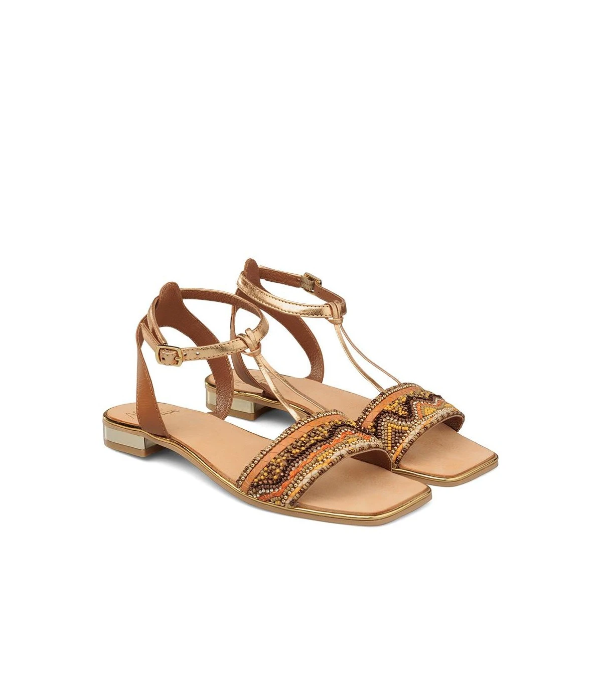 Sandalia plana con tiras de pedrería y trenzados multicolor. Plantilla acolchada para un mayor confort. La altura del tacón es de 1cm.