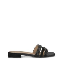 Sandalia plana con tiras cubiertas de pedrería. Plantilla acolchada de ante. La altura del tacón es de 1cm.