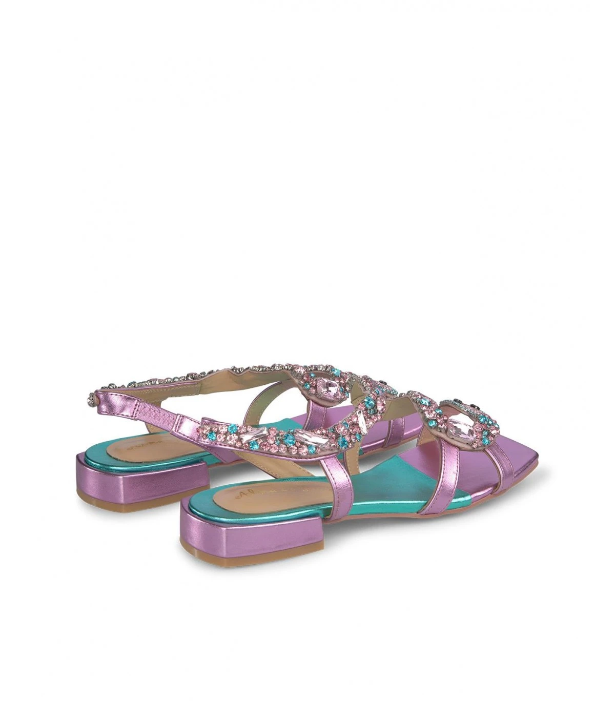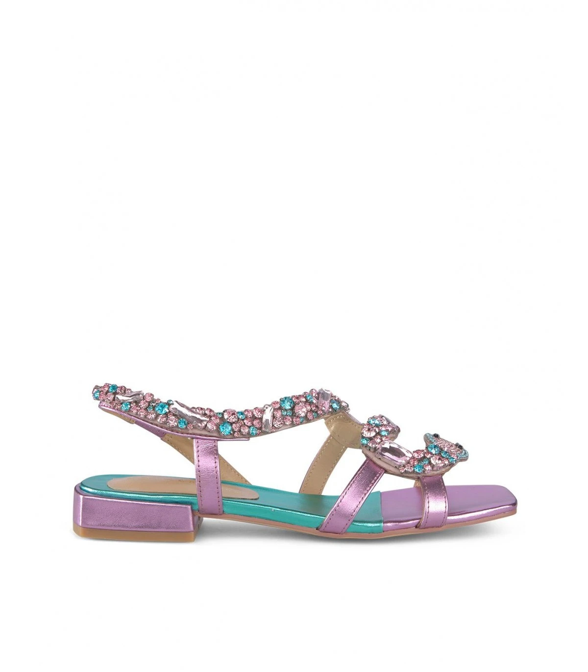 Sandalia plana bicolor con detalle de pederería en forma de serpiente. Plantilla acolchada de ante. La altura del tacón es de 1cm.