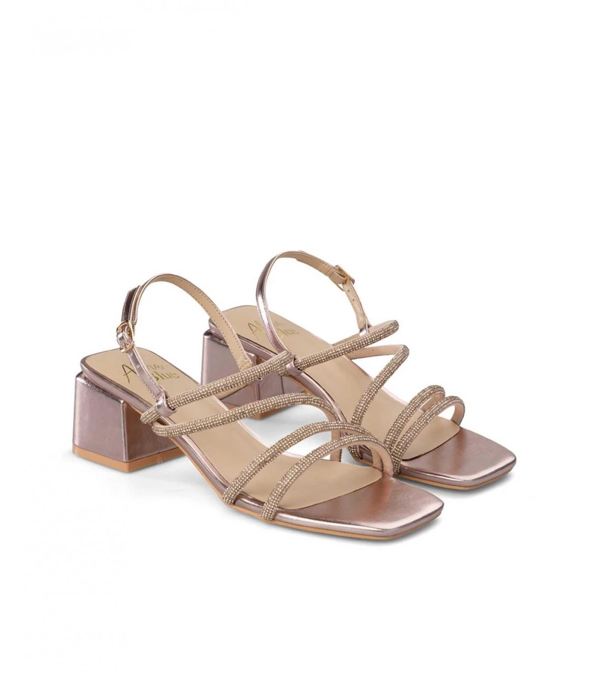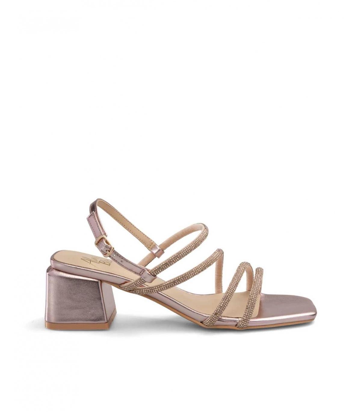 Sandalia de tacón con tiras de tachuelas. Cierre con hebilla ajustable. Plantilla acolchada para un mayor confort. La altura del tacón es de 6cm.