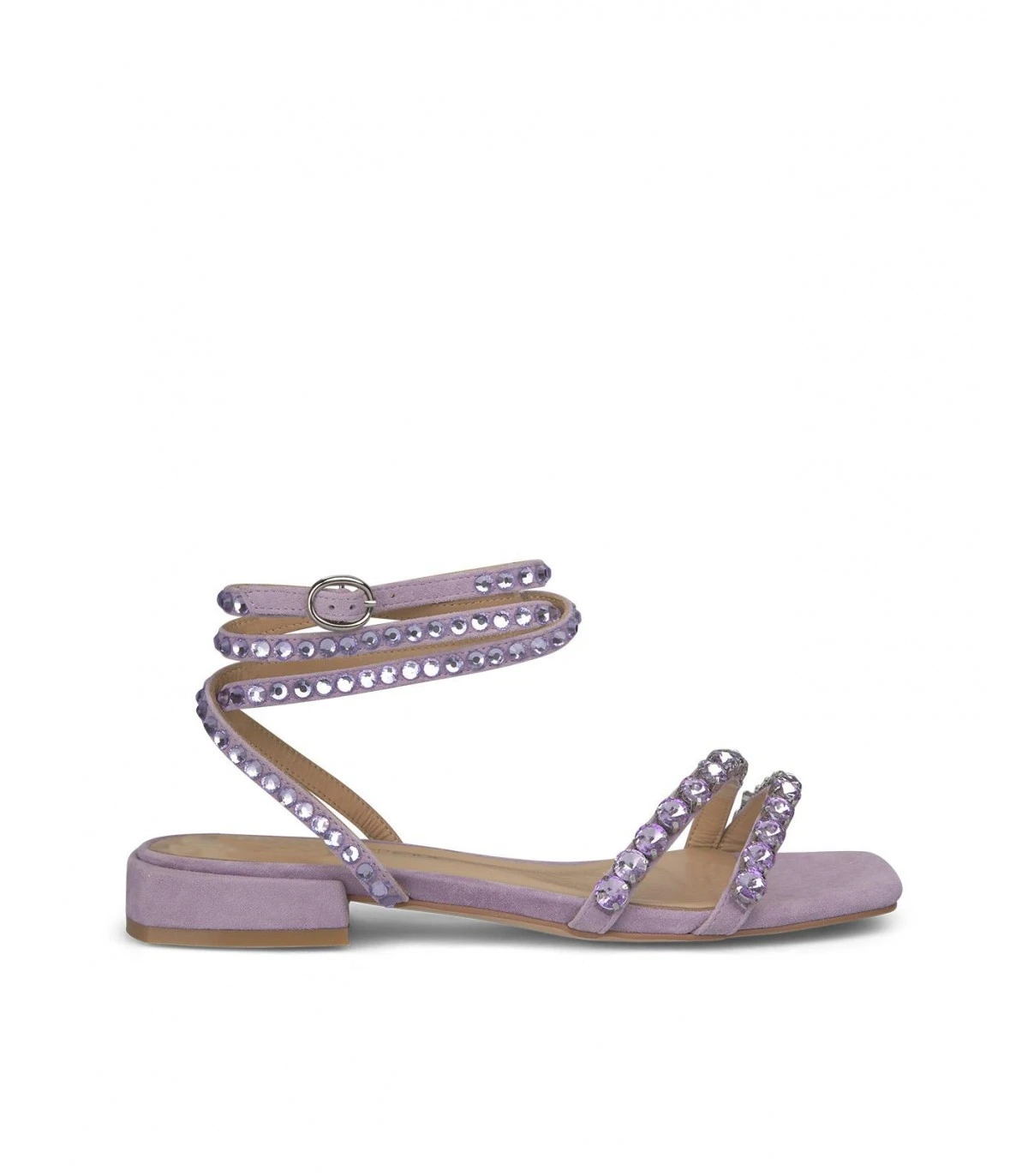 Sandalia plana de ante con tiras cubiertas de pedrería. Cierre con hebilla ajustable. Plantilla acolchada de ante. La altura del tacón es de 1cm.