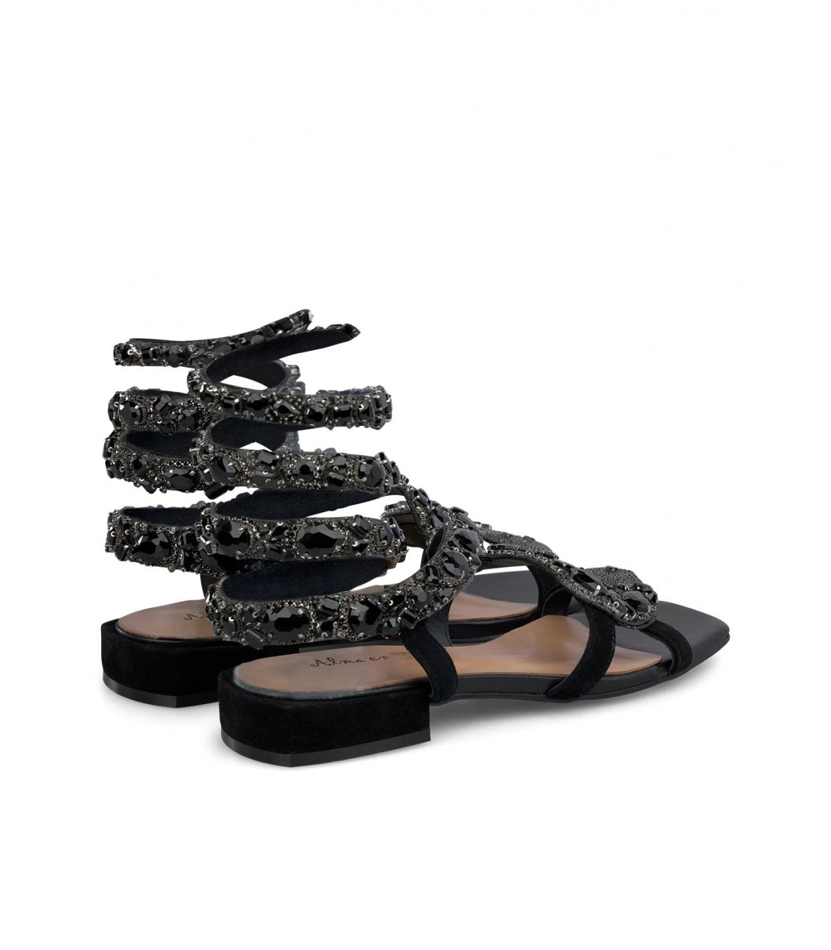 Sandalia plana de piel con tiras cubiertas de pedrería. Plantilla acolchada de piel. La altura del tacón es de 1cm.