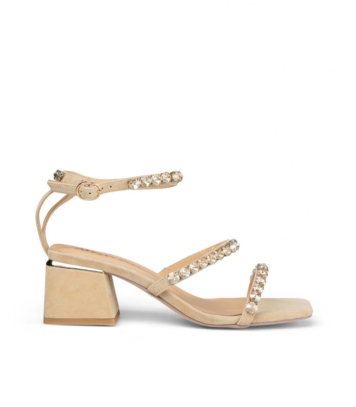 Sandalia de tacón con tiras cubiertas de pedrería. Cierre con hebilla ajustable. Plantilla acolchada para un mayor confort. La altura del tacón es de 6cm.
