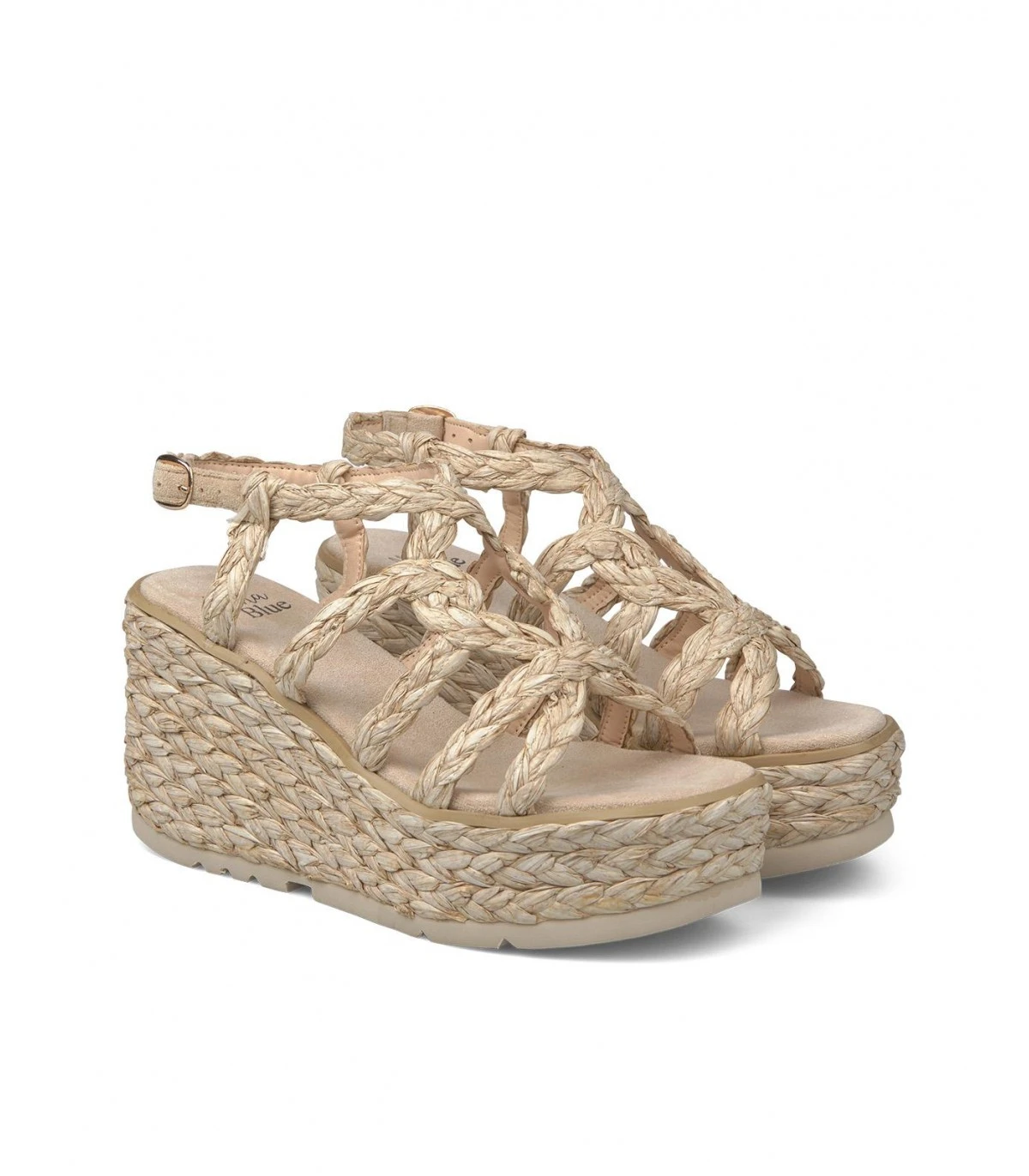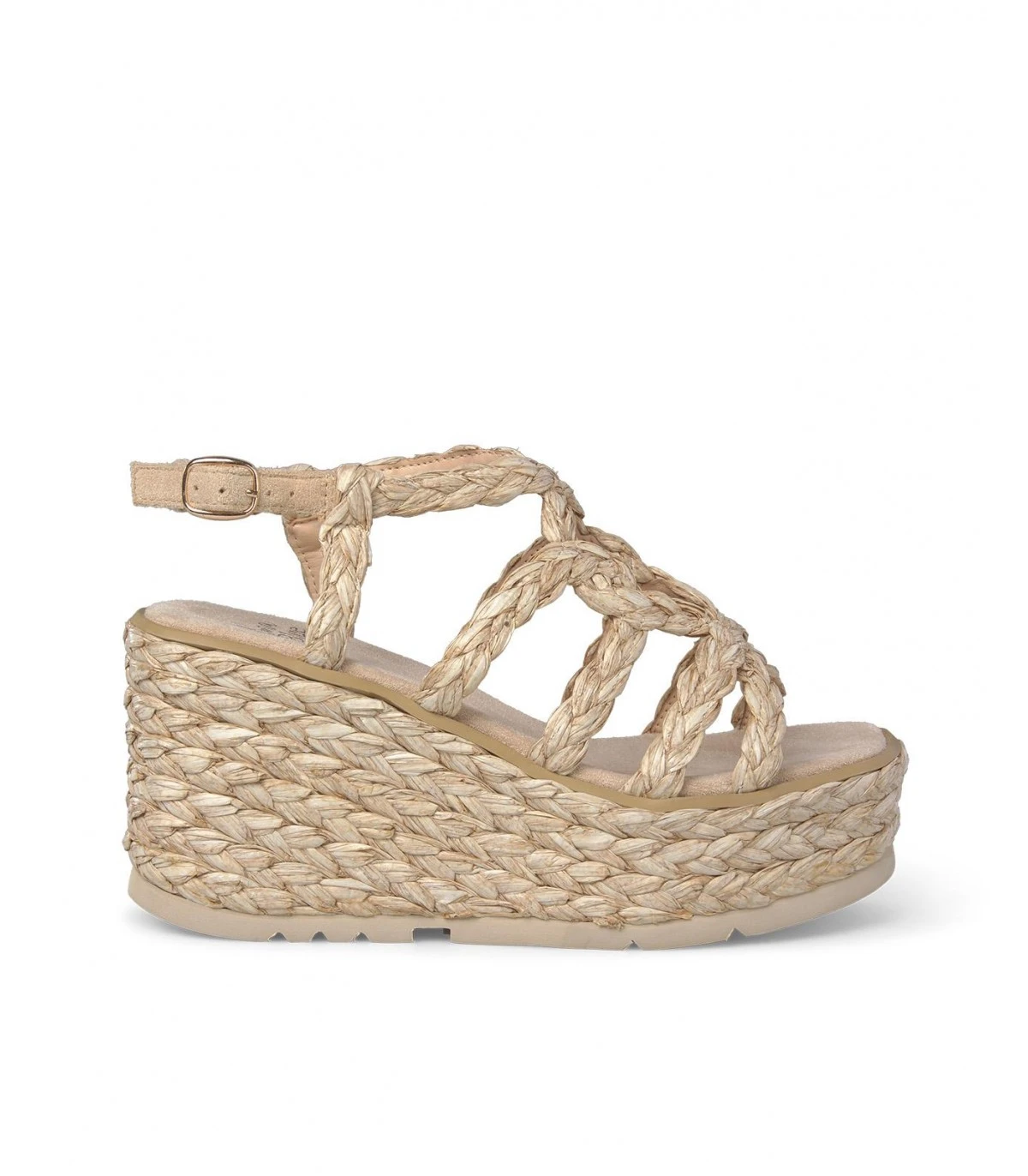Sandalia tipo cuña con tiras trenzadas. Plantilla acolchada para un mayor confort. La altura del tacón es de 9,5cm.