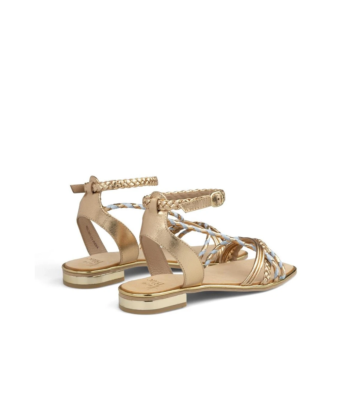 Sandalia plana con tiras de pedrerÃa y trenzados multicolor. Plantilla acolchada para un mayor confort. La altura del tacón es de 1cm.