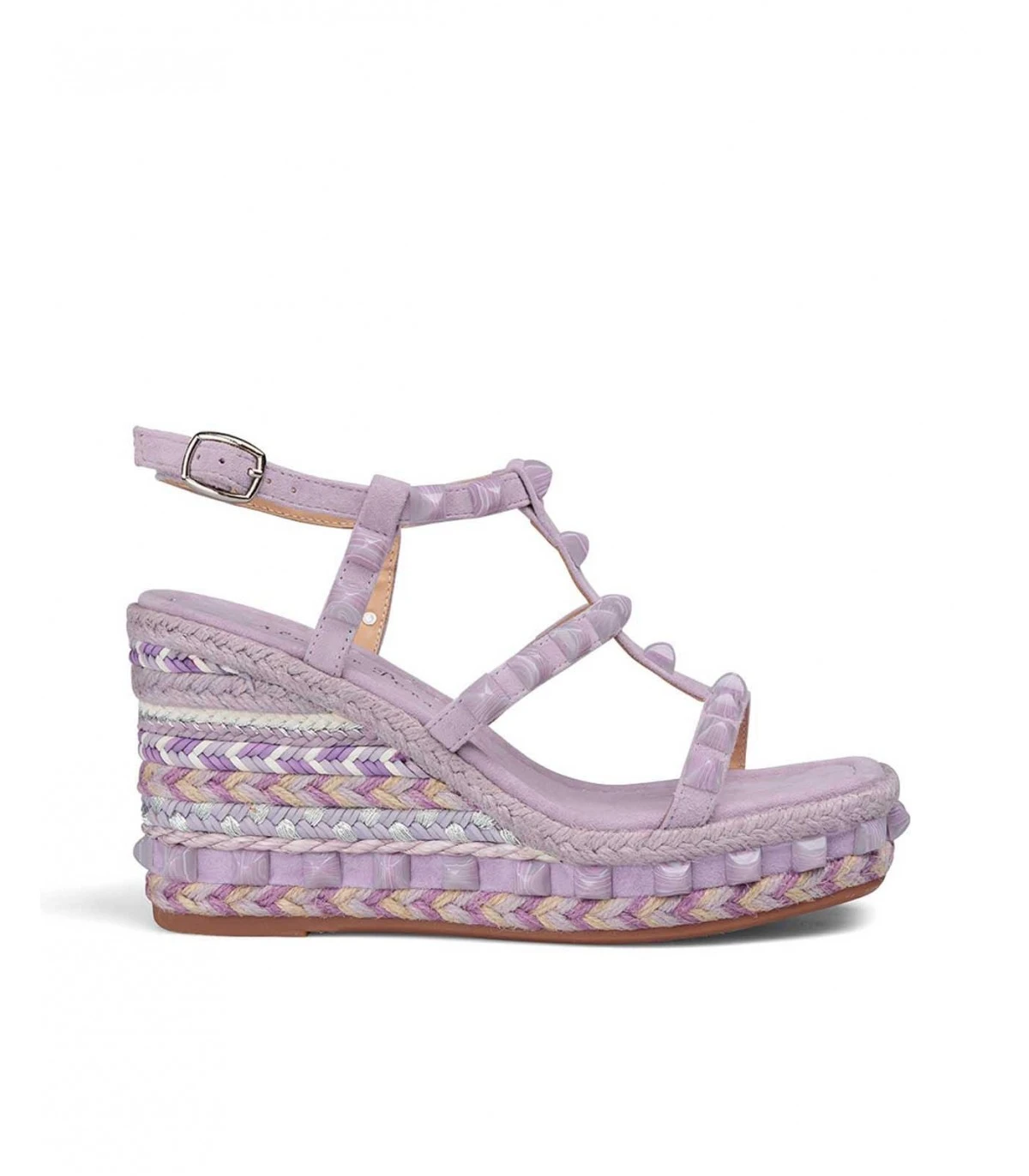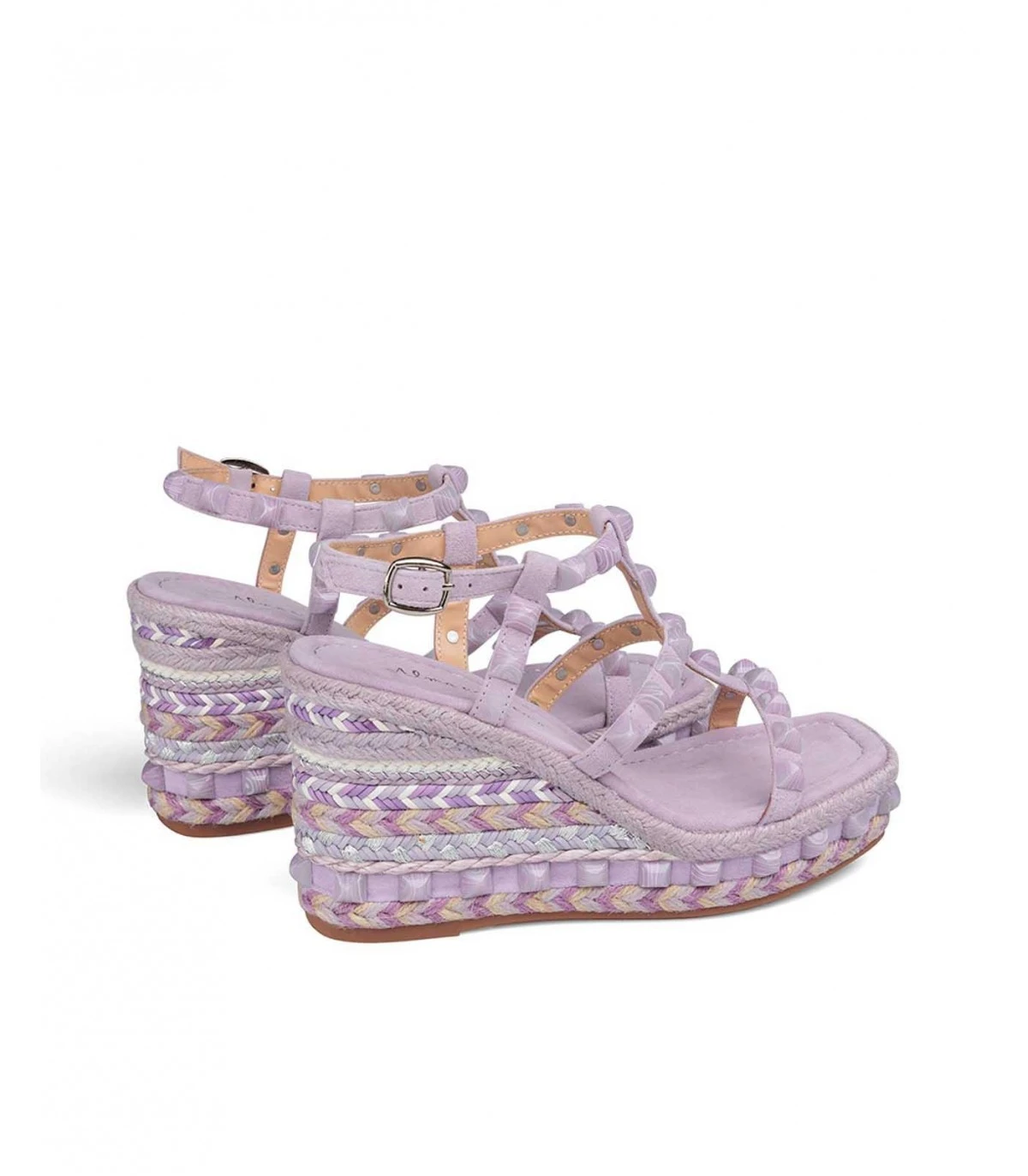 Sandalia cuña de piel con detalle trenzado y de pedrerÃa. Punta cuadrada. Cierre con hebilla en tobillo y altura de tacón de 9,5cm